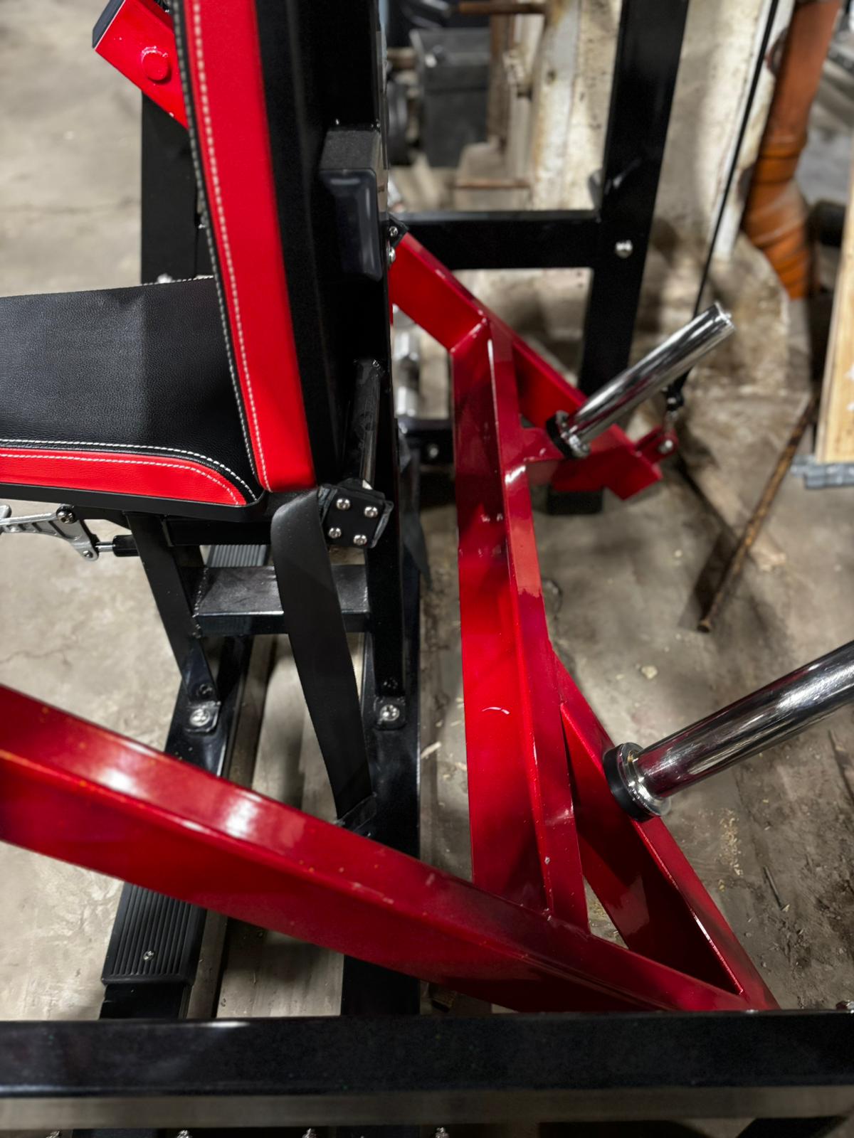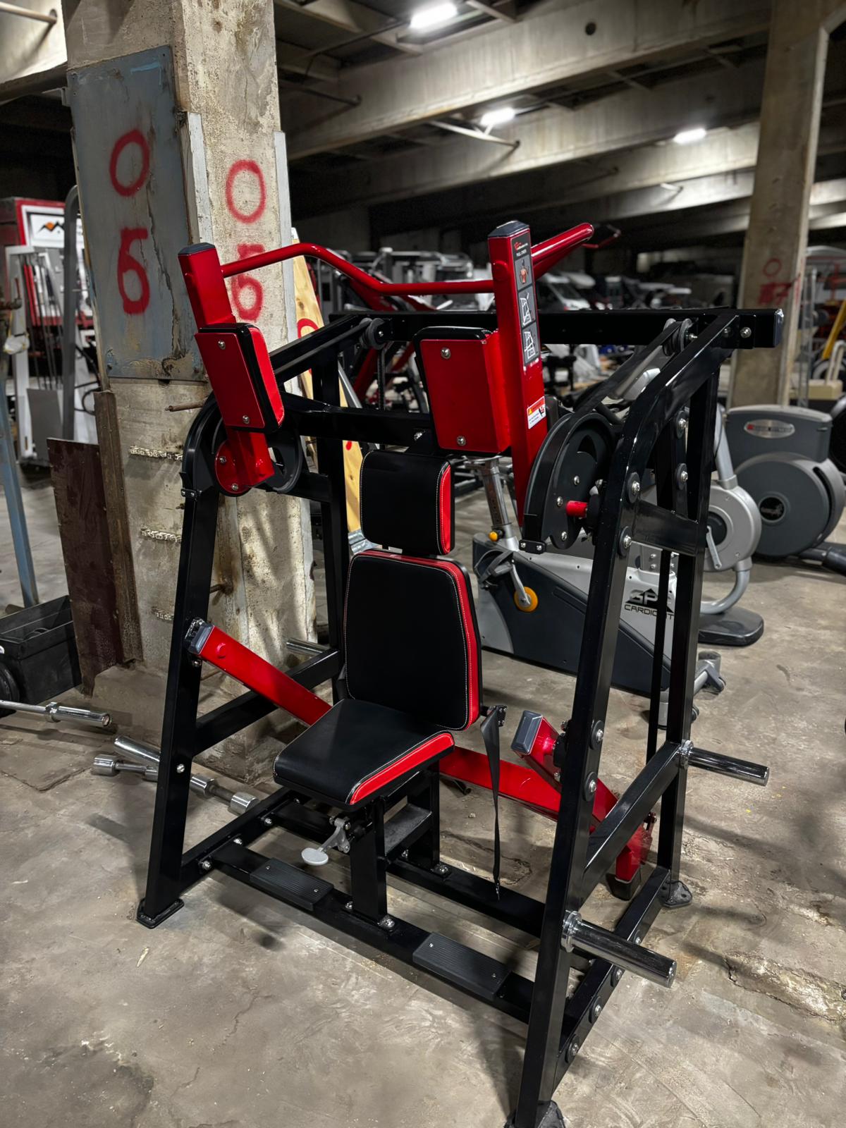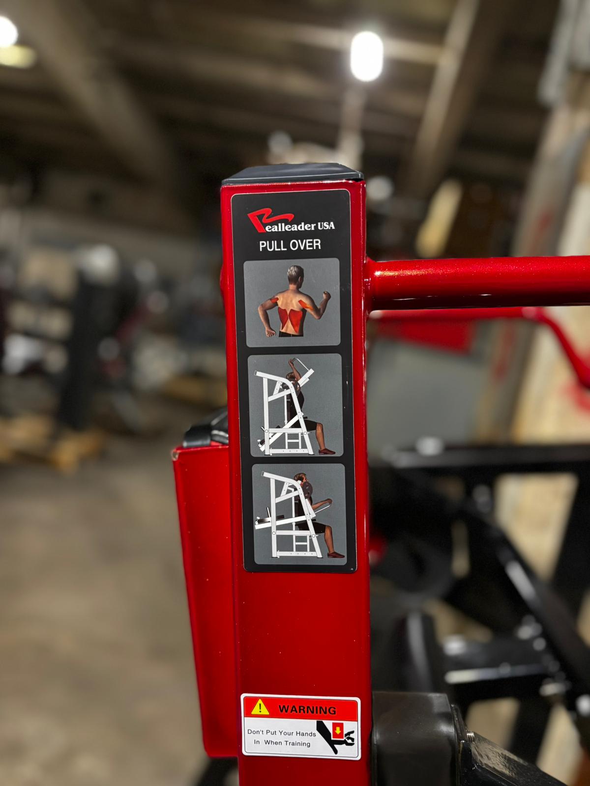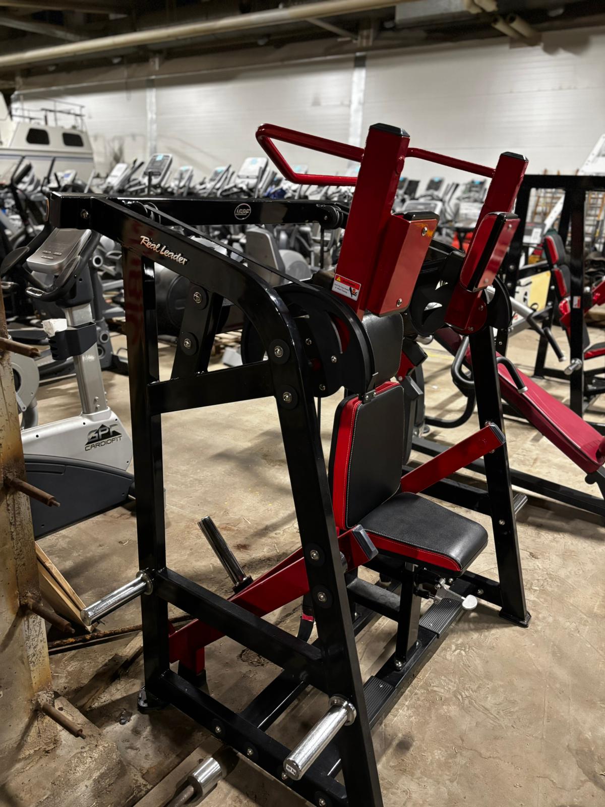 Käytetty Realleader levypainokuormitteinen pullover laite, jossa ominaisuuksina säädettävä istuin, 4 integroitua levypainotelinettä ja turvavyö.